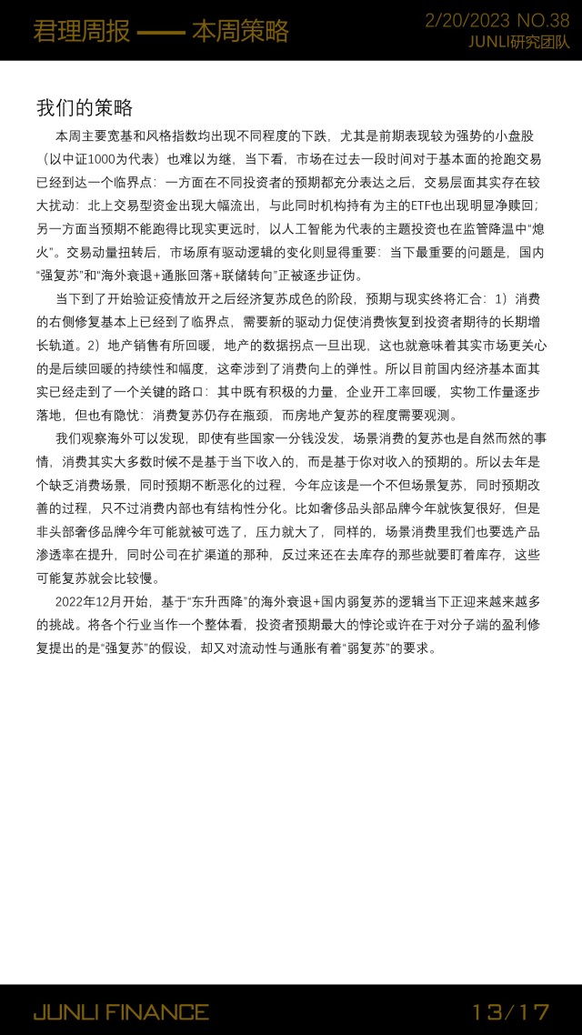 当下到了开始验证疫情放开之后经济复苏成色的阶段,预期与现实终将汇合:1)消费的右侧修复基本上已经到了临界点,需要新的驱动力促使消费恢复到投资者期待的长期增长轨道。2)地产销售有所回暖,地产的数据拐点一旦出现,这也就意味着其实市场更关心的是后续回暖的持续性和幅度,这牵涉到了消费向上的弹性。所以目前国内经济基本面其实已经走到了一个关键的路口:其中既有积极的力量,企业开工率回暖,实物工作量逐步落地,但也有隐忧:消费复苏仍存在瓶颈,而房地产复苏的程度需要观测。 我们观察海外可以发现,即使有些国家一分钱没发,场景消费的复苏也是自然而然的事情,消费其实大多数时候不是基于当下收入的,而是基于你对收入的预期的。所以去年是个缺乏消费场景,同时预期不断恶化的过程,今年应该是一个不但场景复苏,同时预期改善的过程,只不过消费内部也有结构性分化。比如奢侈品头部品牌今年就恢复很好,但是非头部奢侈品牌今年可能就被可选了,压力就大了,同样的,场景消费里我们也要选产品渗透率在提升,同时公司在扩渠道的那种,反过来还在去库存的那些就要盯着库存,这些可能复苏就会比较慢。