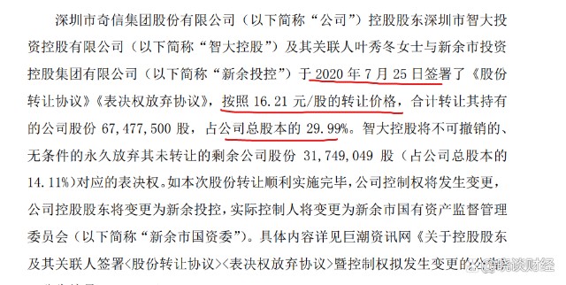2020 年 7 月 25 日,新余投控(代表新余国资)与智大控股及其关联人叶秀冬女士,签署了《股份转让协议》《表决权放弃协议》,以16.21 元/股的转让价格取得后者持有奇信股份67,477,500股,总耗资10.94亿元。新余市国资委于 2020 年 8 月 3 日出具了(余国资字[2020]52 号)同意了收购。从股价看,2020年6月、7月股价在14-16元之间,此次收购价看似合理,但合理的背后并不寻常。