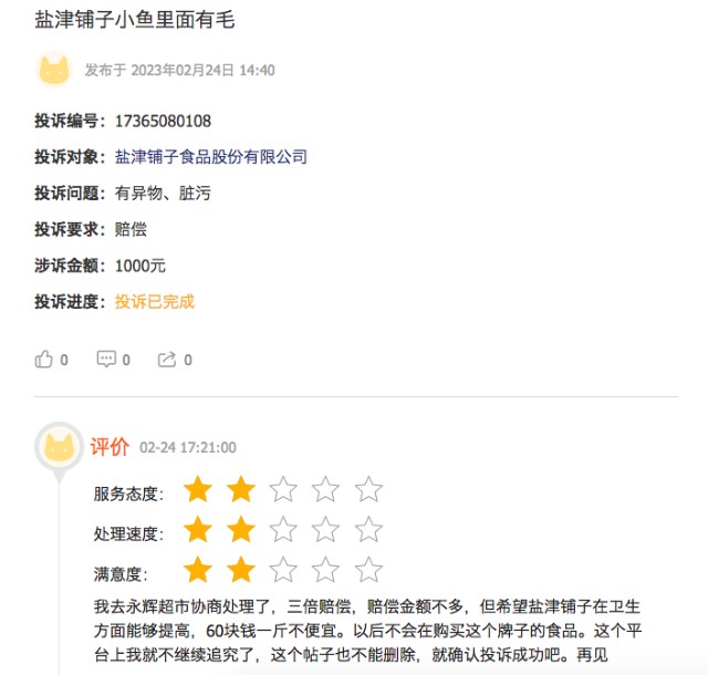 同样是2月24日,另外一位网友的投诉被确认“已完成”,他投诉“盐津铺子的小鱼里有毛”,在永辉超市买的,一打开发现一根很长的毛,因此他吐槽“这卫生条件太差了”,投诉索赔1000元。几个小时后,该网友确认投诉完成,并留言称:
