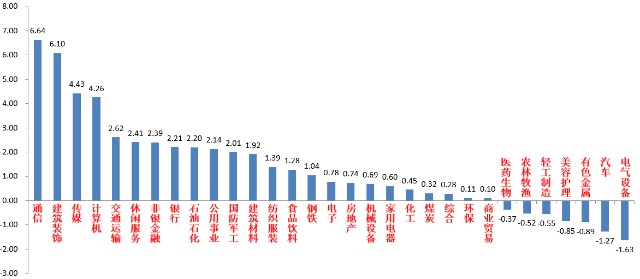 31个申万一级行业中,通信(6.64%)、建筑装饰(6.10%)和传媒(4.43%)居涨幅前三。电气设备(-1.63%)、汽车(-1.27%)和有色金属(-0.89%)居跌幅前三。