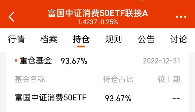 从去年12月31日公布的持仓来看,富国中证消费50ETF联接A重仓持有富国中证消费50ETF,ETF联接基金的持仓配置基本如此,主要是为场外交易者提供参与ETF投资的机会。