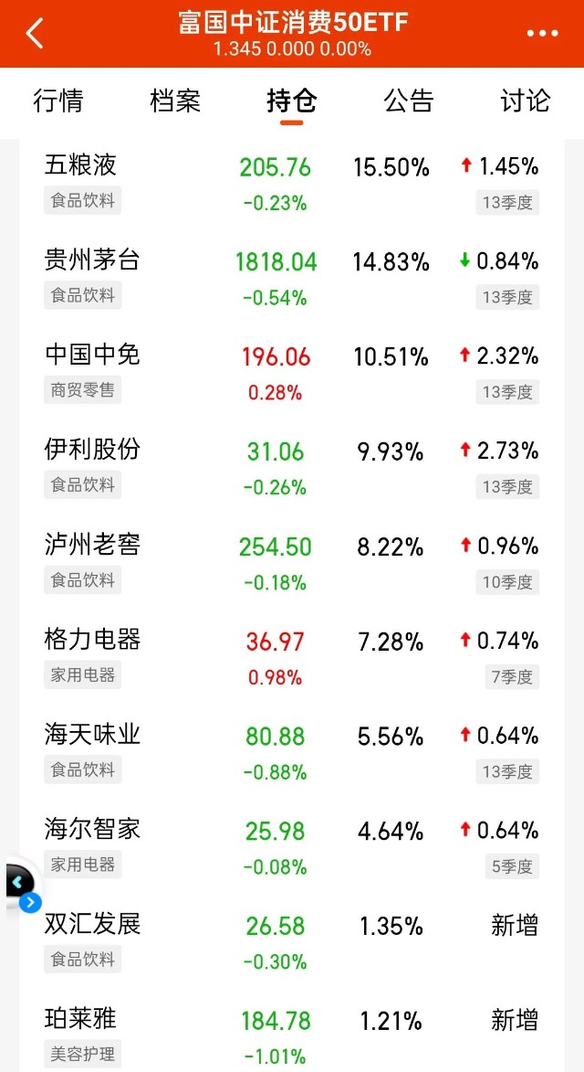 穿透富国中证消费50ETF基金的持仓可以看到,食品饮料配比较高,除了配置白酒龙头五粮液、贵州茅台、泸州老窖外,还配置有乳制品龙头伊利股份、调味品龙头海天味业、肉制品龙头双汇发展。此外,还配置了免税、家电、美妆板块的龙头。