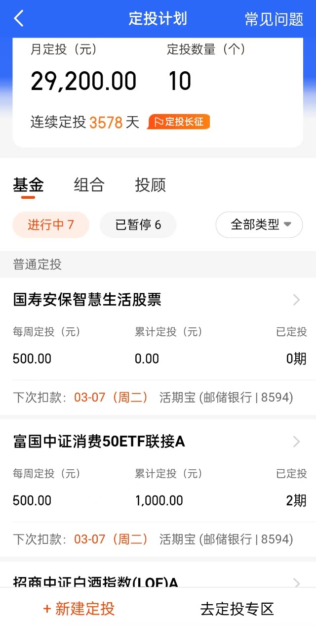 定投金额2档(每周二定投500元),继续定投富国中证消费50ETF联接A基金,招商中证白酒指数A基金,国寿安保智慧生活股票基金(新增),各500元。