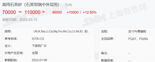 上海有色网数据显示,截至3月9日,高纯石英砂现货均价报8万元/吨,较2月23日5万元/吨的价格涨幅达60%。其中,对纯度、技术要求更高的光伏坩埚内层砂最新报价已达到11万-12万元/吨,国外进口石英砂价格已涨超14万元/吨。