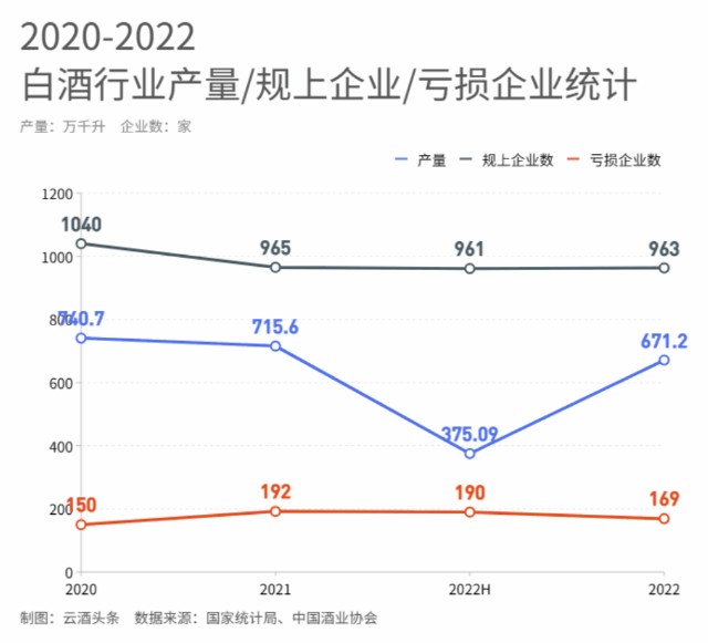 在白酒产量持续下滑的背景下,白酒企业的数量也不断减少。2020年,我国规上(即年产值2000万元以上)白酒企业为1040家;2021年,规上白酒企业为965家;2022上半年为961家,其中190家亏损,全年数量或许会进一步减少。