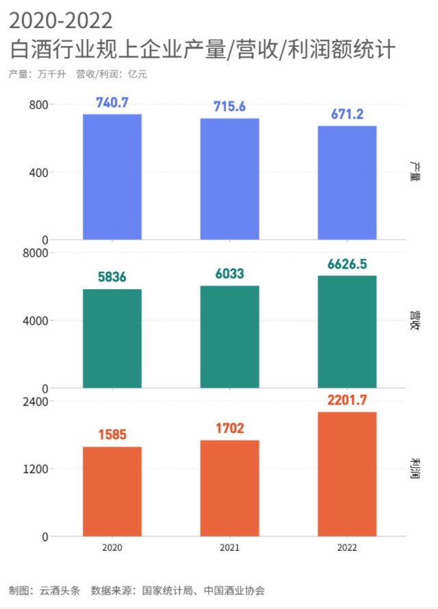 疫情三年来,据国家统计局数据显示,2020-2022年,白酒产量分别为740.7万千升、715.6万千升、671.2万千升,白酒产量持续下滑。