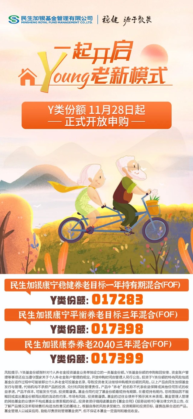 风险提示:1、民生加银康宁稳健养老目标一年持有期混合(FOF)Y份额产品信息来源民生加银基金公告;2 Y类基金份额指针对个人养老金投资基金业务单独设立的一类基金份额。投资于Y类份额的特有风险包括基金在运作过程中可能被移出个人养老金可投基金名录,导致投资者无法继续申购相关份额的风险。以上产品由民生加银基金发行与管理,代销机构不承担产品的投资、兑付和风险管理责任。产品中“养老”的名称不代表收益保障或其他任何形式的收益承诺,产品不保本,可能发生亏损,投资需谨慎。本基金为混合型基金中基金,其预期收益及预期风险水平低于股票型基金、股票型基金中基金,高于债券型基金、债券型基金中基金、货币市场基金及货币型基金中基金。同时,本基金为目标风险系列基金中基金中风险收益特征相对稳健的基金。本基金最短持有期限为一年,在最短持有期内,投资者将面临因不能赎回或卖出基金份额而出现的流动性约束。市场有风险,投资需谨慎。基金的过往业绩并不预示其未来表现,基金管理人管理的其他基金的业绩并不构成基金业绩表现的保证。投资者须仔细阅读基金的《基金合同》《招募说明书》等法律文件及公告,在了解产品情况及听取销售机构适当性意见的基础上,根据自身的风险承受能力、投资期限和投资目标,谨慎选择合适的产品。基金管理人以诚实信用、勤勉尽责原则管理基金资产,但不保证本基金一定盈利和最低收益。