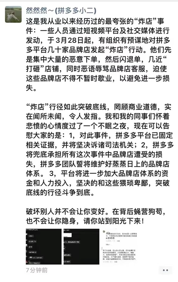据一张网上流传的“拼多多小二”朋友圈截图显示,平台数十家品牌店近日遭遇有组织的“炸店”事件,有人员通过短视频平台及社交媒体发起恶意下单后闪退单,恶语辱骂品牌店客服人员,导致一些品牌店被迫暂时歇业。