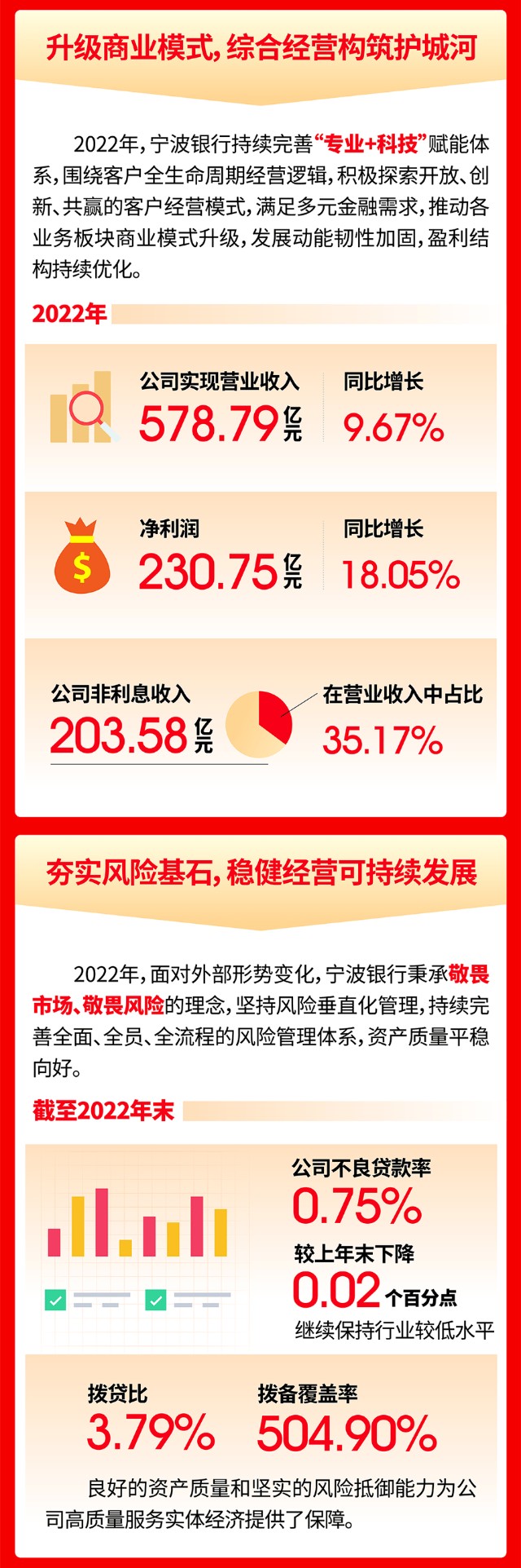 截至2022年末,宁波银行不良贷款余额78.46亿元,逾期90天以上的贷款余额53.21亿元,占比0.51%,较上年末下降0.03个百分点,拨贷比3.79%,拨备覆盖率504.90%,良好的资产质量和坚实的风险抵御能力为公司高质量服务实体经济提供了保障。