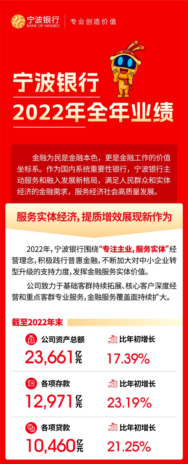 2022年,宁波银行致力于基础客群的持续拓展、核心客户的深度经营和重点客群的专业服务,金融服务覆盖面持续扩大。截至2022年末,公司资产总额23,660.97亿元,比年初增长17.39%;各项存款12,970.85亿元,比年初增长23.19%;各项贷款10,460.02亿元,比年初增长21.25%。