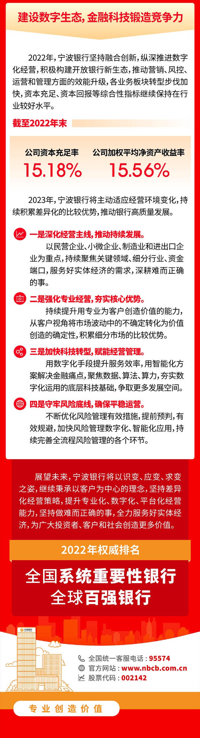 2022年,宁波银行坚持与国家战略相融,与民众需求相伴,积极贯彻落实国家战略部署,支持实体经济转型发展,发挥自身专业优势,加大对民营小微企业、制造业企业、进出口企业、居民财富管理等重点领域的支持投入力度;推动ESG建设,探索将ESG理念与银行发展战略、经营管理相融合,构建推动银行高质量发展的内生动力,为客户、员工、股东和社会创造更多价值。