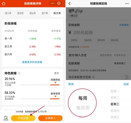 为响应用户反馈,我们于3月初优化了底层规则,在投顾策略定投扣款周期里新增“每周”选项,支持投顾策略周定投。