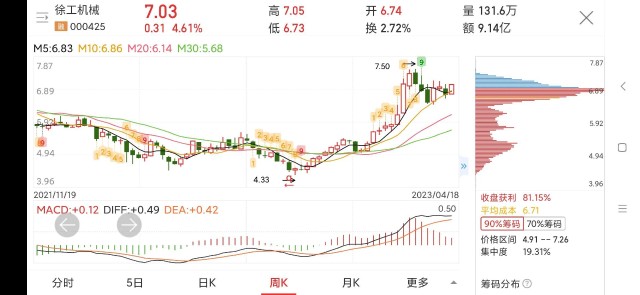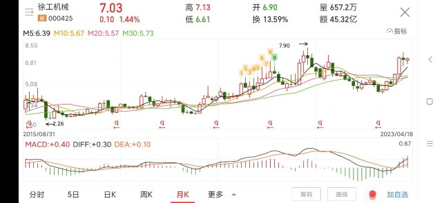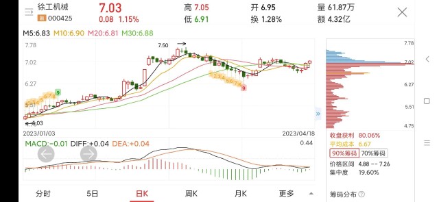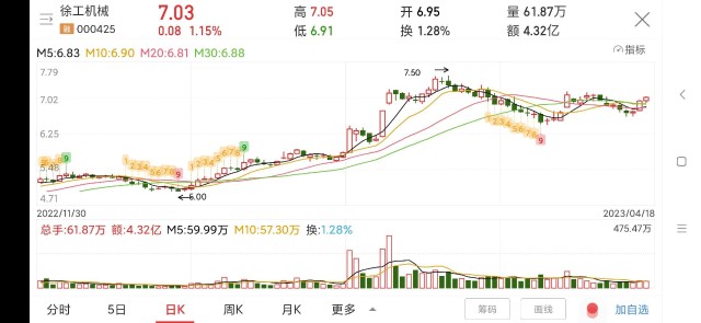 徐工机械股价再次站上7元,上次股价突破7元最终没有站稳,这次股价会最终站稳7元并突破7.5元的高点吗?下面我们来看一下。