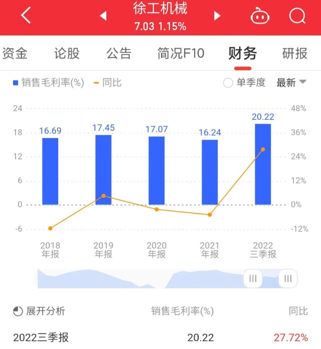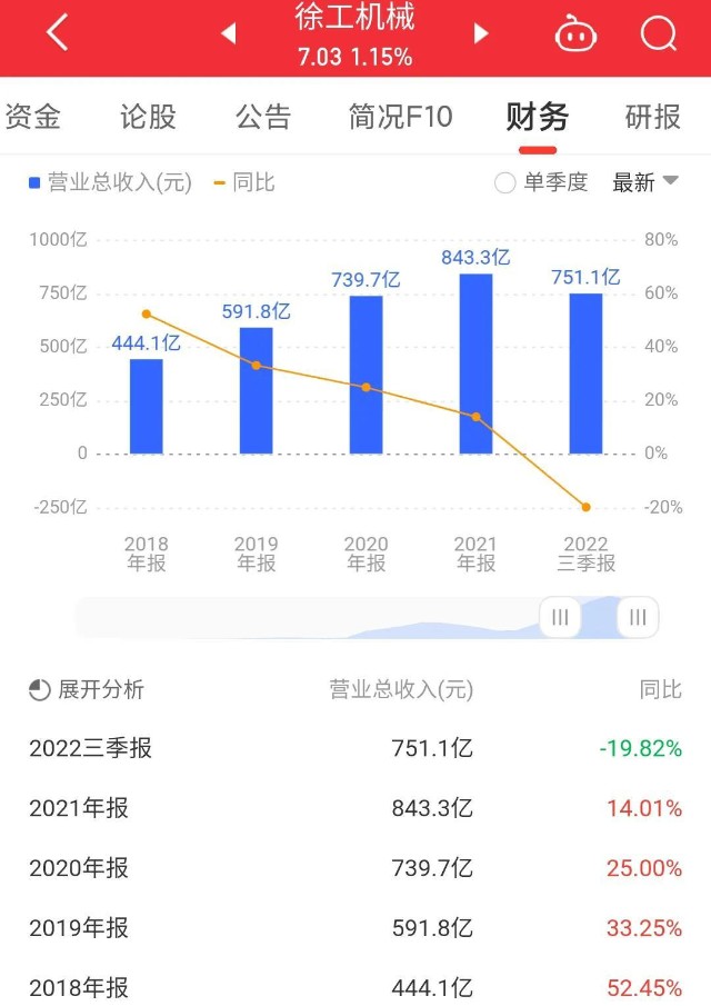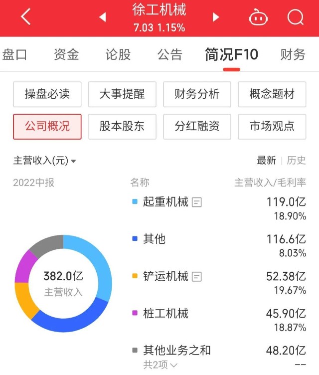 徐工机械属于工程机械行业,工程机械行业有一个共同特征就是周期性。2022年由于受到国内房地产行业的衰退、行业周期、疫情防控等多方面因素的影响,工程机械销量大幅下降。以挖掘机为例:2022年全年,机械行业共销售挖掘机26.13万台,同比下降23.8%。其中,其中国内销量15.19万台,同比下降44.6%;出口销量10.95万台,同比增长59.8%。本来今年应该是工程机械行业的谷底,净利润应该大幅下降50%以上的,但由于国外新兴市场经济增长强劲,机械出口同比大增,工程机械行业的谷底可能会被完美避过。