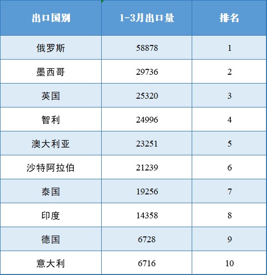 与此同时,1-3月,我国汽车出口金额的前十大国家分别是俄罗斯、美国、墨西哥、英国、比利时、日本、澳大利亚、德国、阿联酋和韩国。