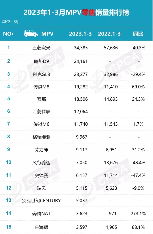 从车型划分,一季度,轿车市场零售销量201.9万辆,同比下降14.8%;MPV(多用途汽车)市场零售销量24.3万辆,同比小幅增长1.3%;SUV(运动型多用途汽车)市场累计零售销量200万辆,同比下跌13.6%。