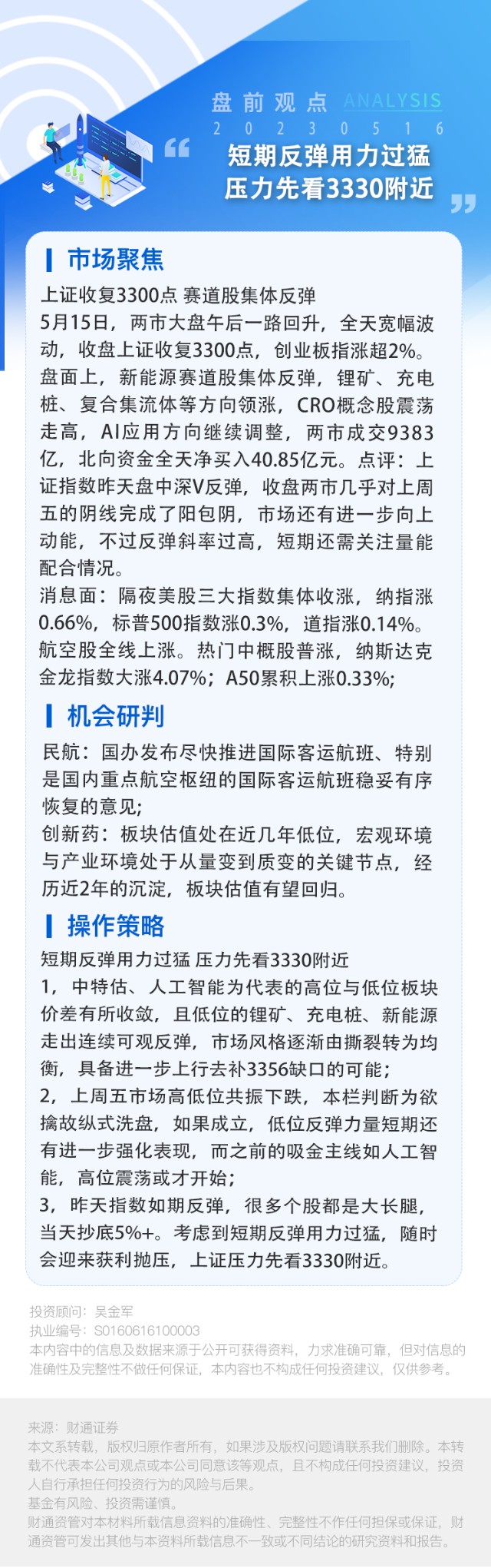 5月15日,两市大盘午后一路回升,全天宽幅波动,收盘上证收复3300点,创业板指涨超2%。盘面上,新能源赛道股集体反弹,锂矿、充电桩、复合集流体等方向领涨,CRO概念股震荡走高,AI应用方向继续调整,两市成交9383亿,北向资金全天净买入40.85亿元。点评:上证指数昨天盘中深V反弹,收盘两市几乎对上周五的阴线完成了阳包阴,市场还有进一步向上动能,不过反弹斜率过高,短期还需关注量能配合情况。