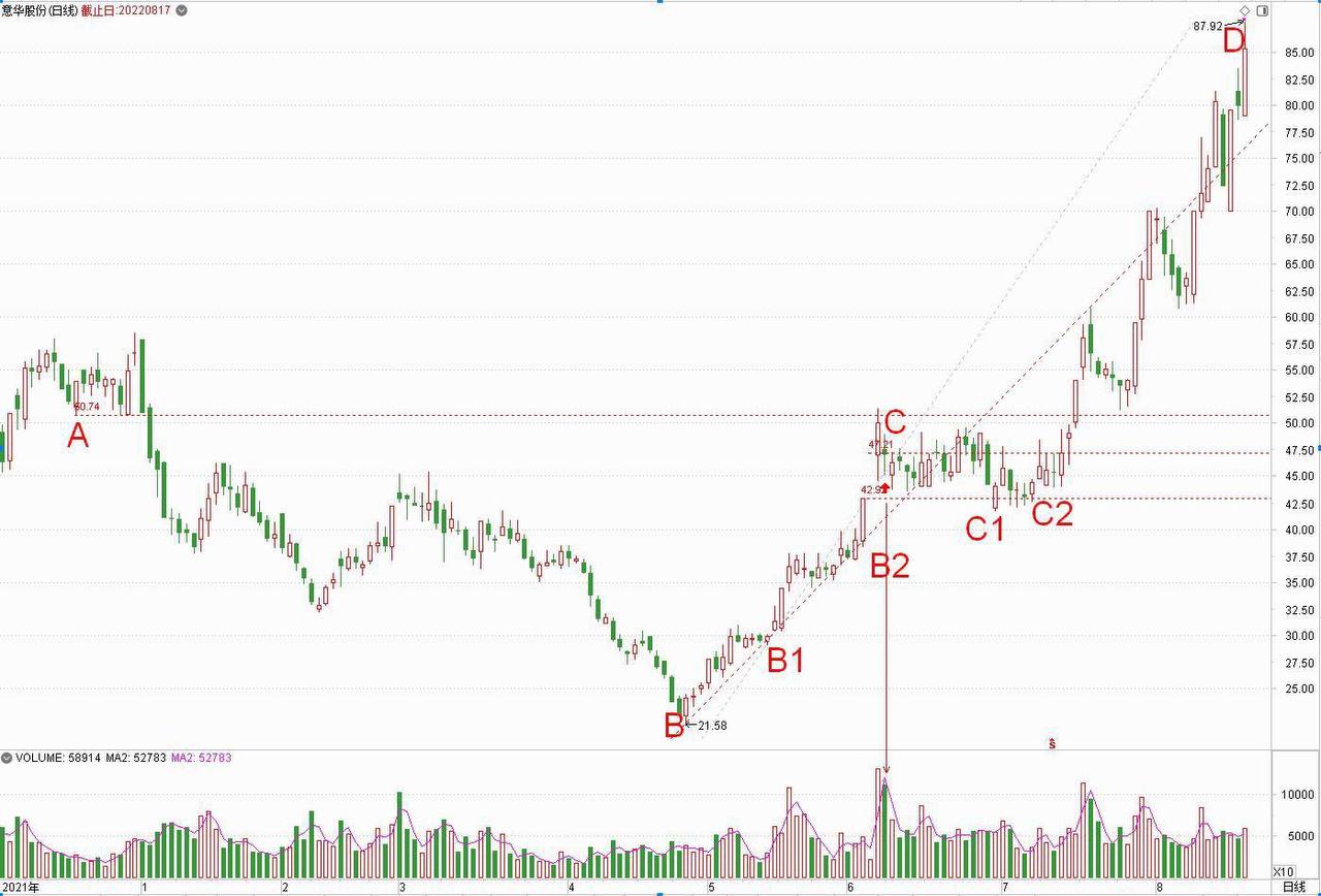而从视频课后面的走势看,第二天一开盘就跌破了B1-C烽火叉,到收盘也没有收上去,所以只能等第二个伏击点。而该股后面的走势,也是一路小幅震荡向下,当它跌到B2三结义前锋柱实顶附近时,果然出现了强有力的支撑,并经过几次震荡之后,终于在C1-C2区间站稳了B2线,并在C2柱那天形成了确定性的买点。之后,股价开始掉头向上突破,虽然压力不小,但最终还是一路攻城略地,到20220817的D柱止,股价最高拉到了87.92元,如果从第二个伏击点B2实顶线42.92算起,到D柱的虚顶时,最高也拉了104.95%。