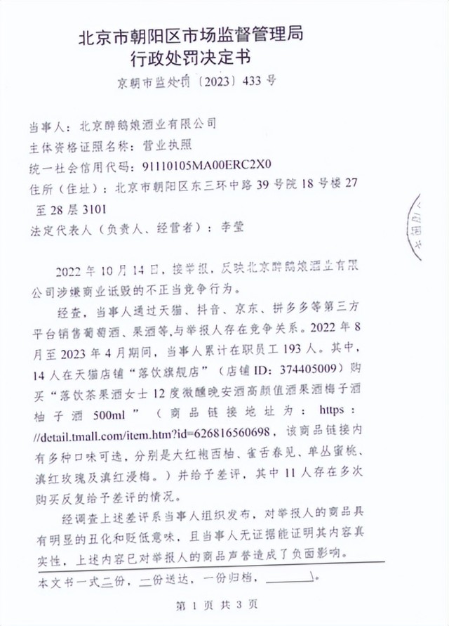据悉,北京醉鹅娘酒业有限公司在2022年8月至2023年4月期间,累计在职员工193人。其中有14人在天猫店铺“落饮旗舰店”购买“落饮茶果酒女士12度微醺晚安酒高颜值酒果酒梅子酒柚子酒500ml”产品并给予差评,其中11人存在多次购买反复给予差评的情况,主观恶意明显。