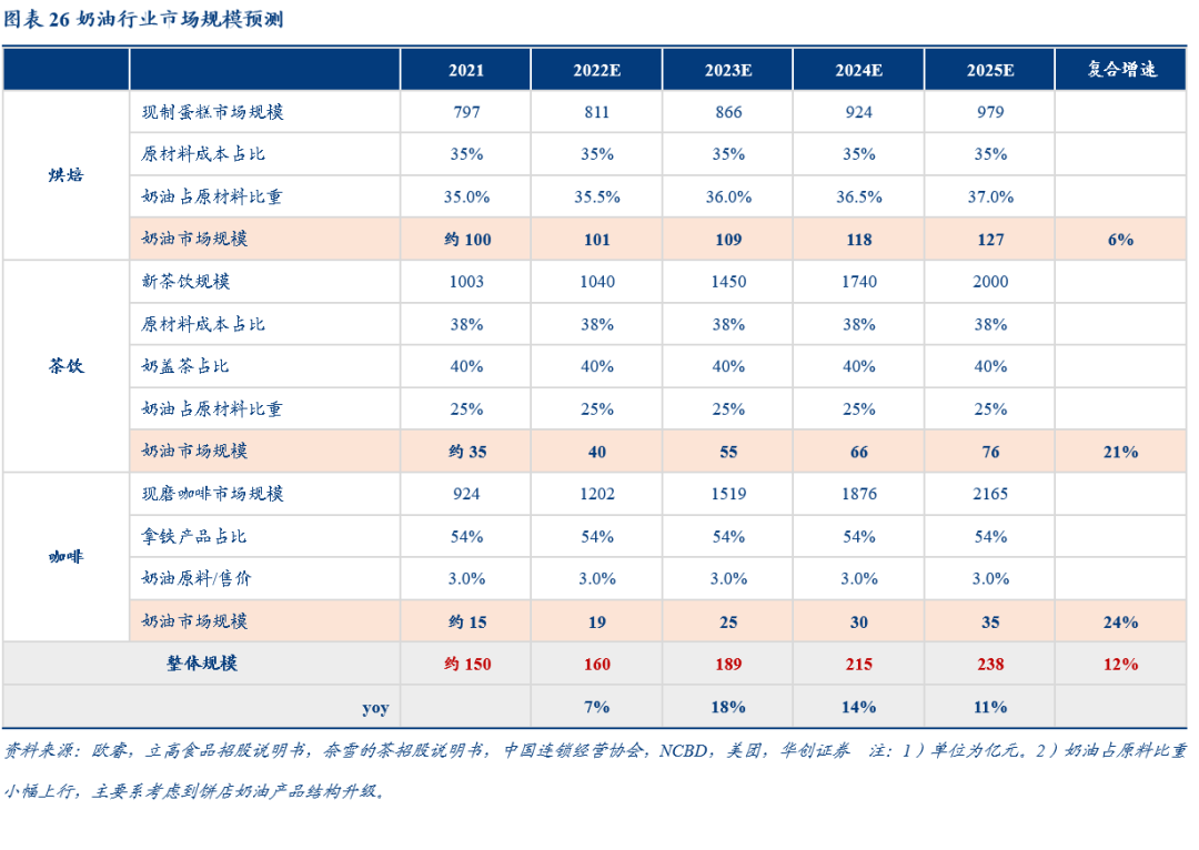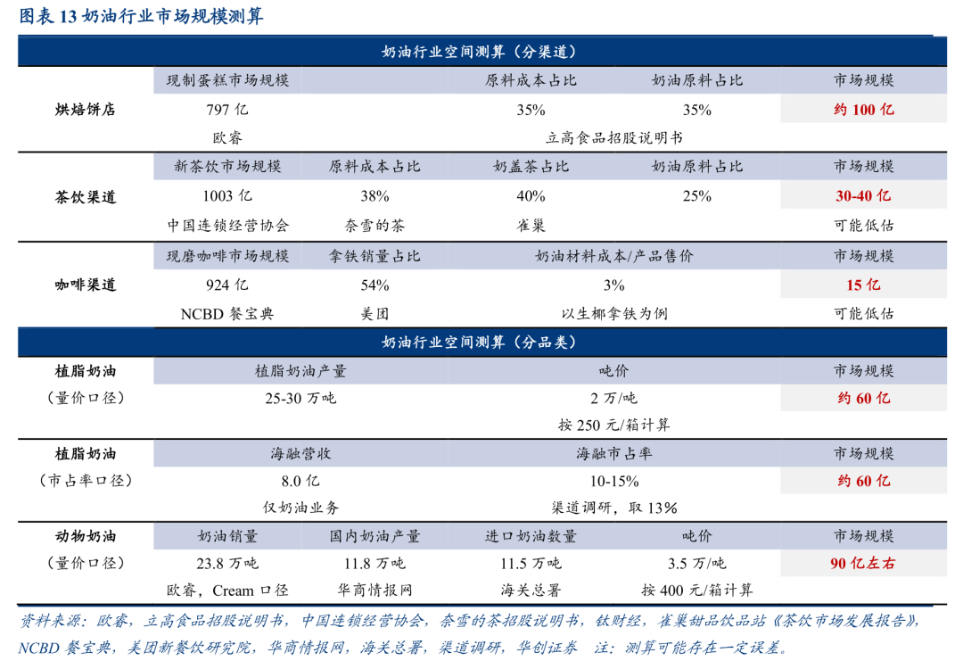 咖啡:以生椰拿铁为例,若每份添加奶油50克,估算得每份奶油原料约0.5-0.8元,相较售价20元比例约为3%,NCBD数据显示21年现磨咖啡市场规模924亿,据美团数据拿铁占总体销量的54%,则大致估算咖啡渠道空间为15-20亿。