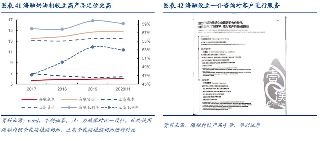 对比立高:产品溢价、重客服务更优,但通路渠道能力更弱。产品结构上,对比立高,公司单位生产成本更低,但每千克售价却高出1元以上,产品定位相对更高,且海融18年推出非氢化工艺,21年推出0胆固醇奶油,当前推出植物基产品,植脂产品开发较立高更为领先。重客服务上,公司一仆咨询当前20人左右,与公司“达摩院”、销售团队一并为重客提供定制解决方案,大B服务能力强于立高。但在小B渠道上,尽管单兵经验更加丰富(20H1海融/立高30岁以下员工占比26%/47%),但客观来说,由于公司文化、团队规模、激励政策等不同,海融小B渠道渗透能力弱于立高,下沉仅到市级以上,客户亦多为中大型连锁。