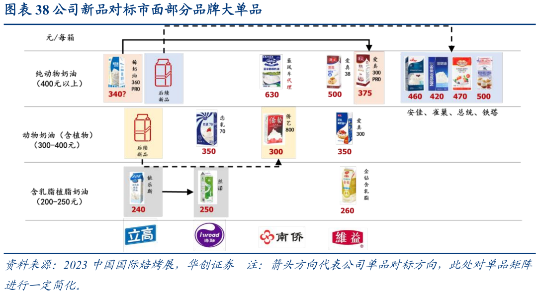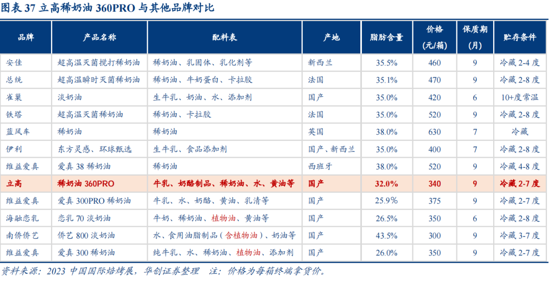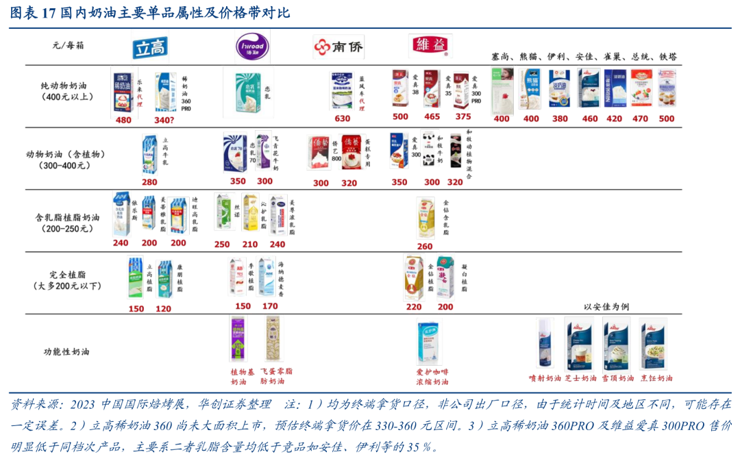 纯动物奶油:基本在400元以上:配料表中不含植物成分,其中南侨代理的蓝米勒(蓝风车)定价最高,往下主流产品包括为总统、安佳、铁塔等,进口产品一般在450元以上,而国产奶源的熊猫、伊利、塞尚、雀巢等售价更低,大多在400元上下。除乳制品企业外,不考虑实质进口产品如维益爱真38、名派稀奶油、纽丝伦800等,国内烘焙企业仅立高具备生产能力,新品澳系风味稀奶油360PRO定价预计在340元左右。