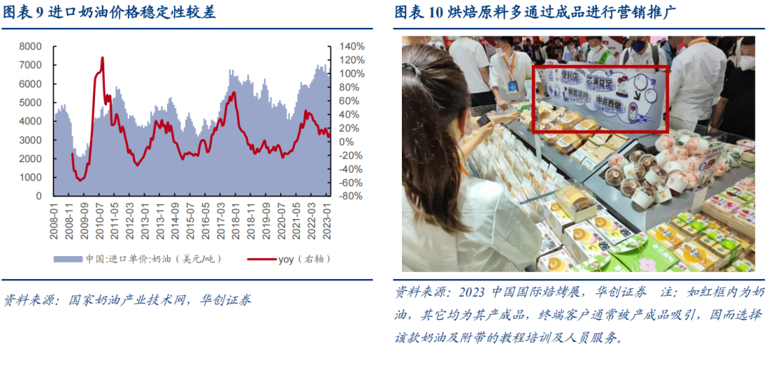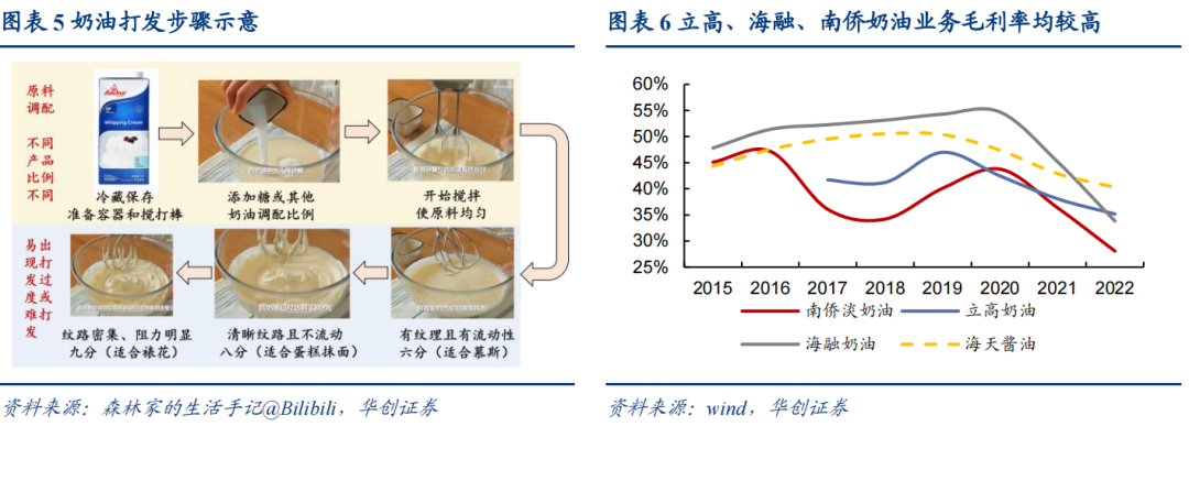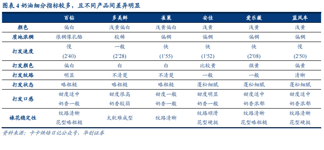 相同点一是粘性高:厨师一般不轻易更换调味品,间接导致行业易守难攻,亦是抬高板块估值的核心因素。而奶油在使用方面,核心步骤打发需精确控制时间及温度,且部分师傅会根据经验习惯,将不同品牌按比例混合后再打发,一旦切换需重新学习,存在较高的替换成本。食用方面,首先不同奶油颜色不同,如伊利偏白、安佳偏黄,其次味道存在差异,如蓝风车奶香更足、雀巢偏油腻,部分消费者能感知到奶油品质变化,因此饼店不轻易更换奶油。渠道方面,奶油多与其他原料协同供货,如安佳奶油与黄油、奶酪,南侨奶油与烘焙油脂等等,同样存在类似海天单品捆绑逻辑,且销售人员通过终端上门服务,客情关系通常更好,故一般不更换单一配料。