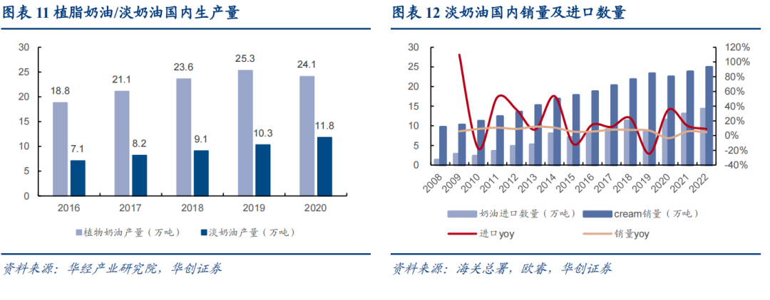 动物奶油:一方面据华经情报网,20年淡奶油产量11.8万吨,加上进口奶油11.5万吨,整体规模约在20万吨出头,另一方面,欧睿数据显示21年国内奶油(Cream)销量为23.8万吨,综合预计当前淡奶油规模在25万吨左右,按吨价测算市场规模在90亿左右。