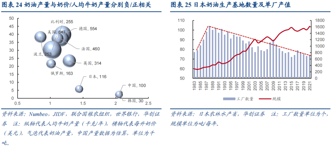 三是国产替代存在空间:日本早期受限于畜牧业发展水平,奶油产量同样不高,但伴随人均牛奶消费量触顶,及需求升级下乳脂奶油需求提升,部分企业重点转向乳制品加工,当前日本奶油进口量相对较少,国内市场明治、雪印等乳企龙头领先。回到国内,当前奶源对比欧美品质差距持续缩小,但核心仍在奶价,伴随经济稳定增长,国内奶价对比欧美国家相对价格趋于下降,驱动奶油行业结构升级的同时,国产企业竞争力亦有望得到强化。