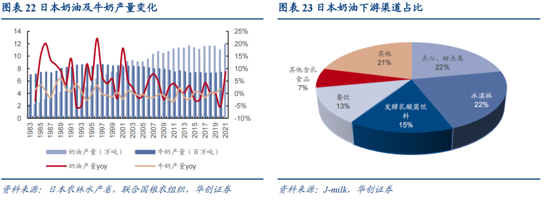 二是渠道可进一步打开:以淡奶油为例,据日本乳业团体“J-milk”,当前日本奶油烘焙渠道占比不到25%,而餐饮/饮料/冰淇淋等分别占到13%/15%/22%,且90年代日本咖啡渠道奶油市场规模即达到300+亿日元。对比来看,当前国内烘焙渠道占比高达60%左右,伴随需求升级加速、应用场景拓宽,茶饮、咖啡甚至餐饮等渠道均有望进一步打开。