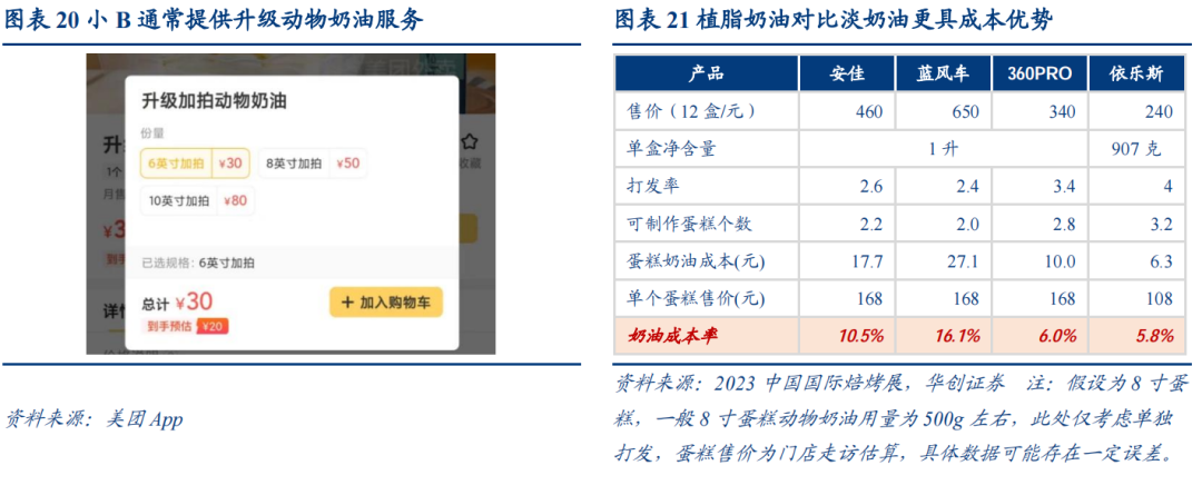 小型饼店:小B溢价有限,故对原料成本把控更严,在实际销售中为洗去“植物奶油”标签,加上后厨制作相对封闭,部分情况下会将动植物奶油混打使用,若未标注“动物奶油”则基本为植脂,此时商家通常提供“加钱升级为动物奶油”等选项。分产品类别来看,若为稀奶油或淡奶油标签,且对比高价位产品性价比突出,则竞争优势自然明显;若仍是植脂奶油,在同一价格档位内,核心比拼产品品质,尤其体现在口感更接近动物奶油。此外小B更加下沉,厂商若能提供稳定供货甚至与其他原料协同,同时适当帮助新品研发、技术培训、营销支持等,则往往更易切入小B饼店,对应到企业渠道能力更为关键。