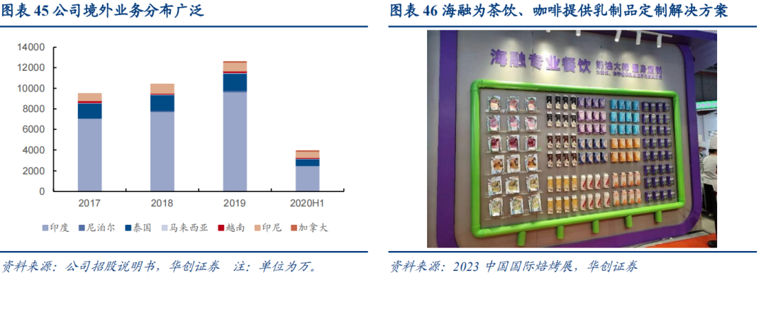 植脂奶油:华商情报网显示20年植物奶油产量在24.1万吨,同时结合渠道反馈信息,海融市占率约在10-15%左右,我们合理估计植脂奶油用量略高于淡奶油,且集中应用在烘焙渠道,整体销量预计在25-30万吨左右,市场规模约60亿。