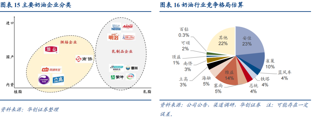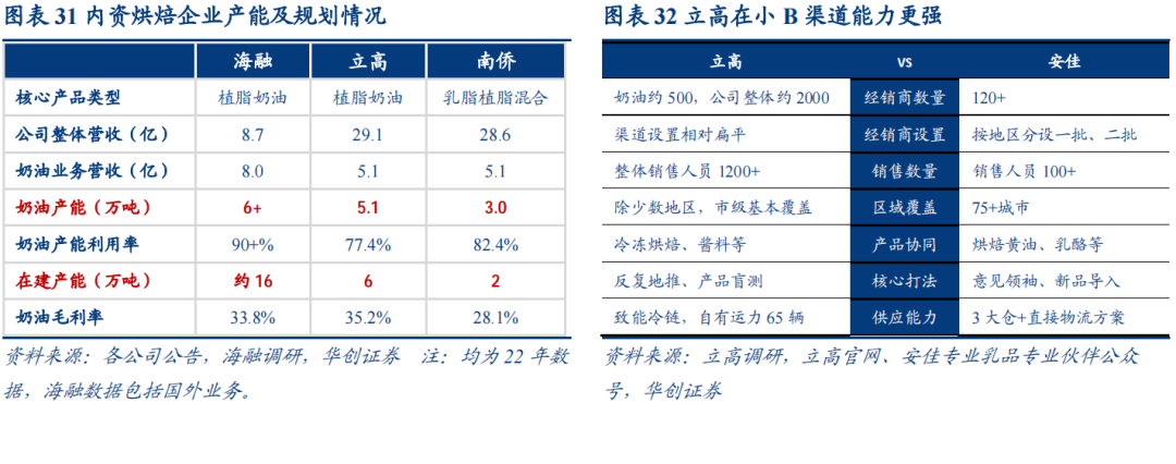 上市企业:对比安佳等巨头仍有差距,但扬长避短、错位竞争,企业增量空间依旧充足,看好立高成长提速,关注海融渠道下沉、南侨产品推新。