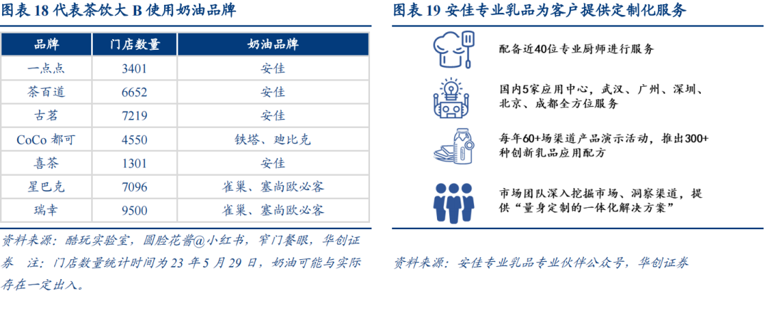 连锁茶饮/咖啡:一方面植物奶油使用前需冷藏解冻,不适合门店即时操作,另一方面植物奶油食用口感及客户观感均较差,故茶饮/咖啡基本选用动物奶油,甚至在营销中强调使用高端奶油以提升品牌力,仅少部分产品在茶基底添加植物奶油替代植脂末,如茶颜悦色奶顶为安佳、奶底为雀巢,同时曾少量使用维益爱护咖奶进行调味,星巴克、瑞幸则使用雀巢、欧必客。此外茶饮推新频率极高,且门店设备及人员配置较低,对供应商产品研发要求更高,具体体现在一是配套研发支持,二是产品更高品质,如安佳17年应喜茶要求,联合打造厚芝士奶盖,随后快速引爆市场。