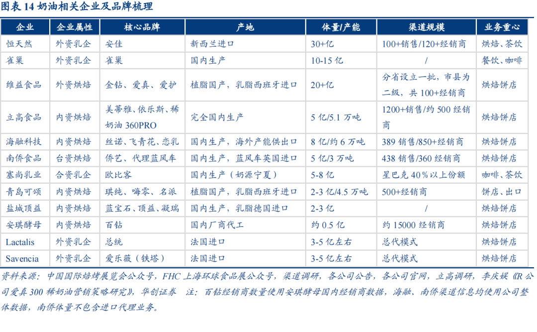 竞争概览:寡头垄断竞争,内外资错位比拼。整体格局上,植脂奶油呈现一超多强局面,其中美国维益体量20+亿,海融、立高市占率约在10%左右,剩余国产品牌相对分散,动物奶油方面安佳遥遥领先,其他外资品牌如雀巢、总统等体量较大,而国产份额较低。根据产品定位及属性不同,奶油单品上存在四档分层,外资品牌多集中在400元以上,更偏动物奶油,国产品牌如立高、海融集中在200-300元左右价格带。分渠道来看,大B看品牌及解决方案,小B比性价比及渠道,咖啡茶饮多使用高档动物奶油,核心比拼品牌及研发能力;连锁大B少量使用植脂,竞争要素为定制化服务能力;饼店小B一般植脂乳脂混用,更看产品性价比及企业渠道下沉能力。