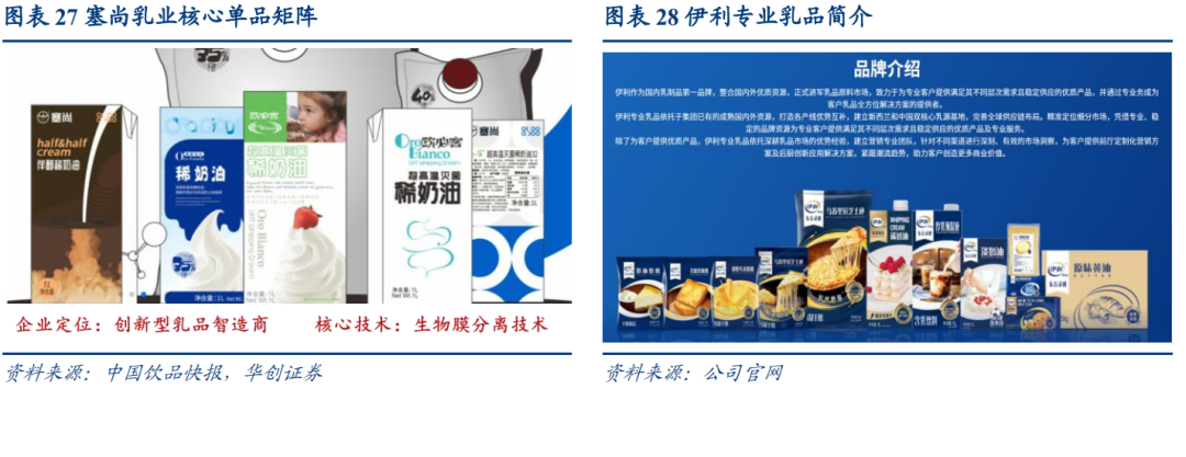 渠道:原料及品牌优势下,理论上伊利、蒙牛竞争力最强,但当前2C市场包括牛奶、奶酪等仍有向上空间,且国内乳企普遍缺乏B端基因,尽管包括伊利发布专业乳品品牌、蒙牛推出爱氏晨曦主攻专业乳品,但资源倾斜程度尤其对小B相对有限。