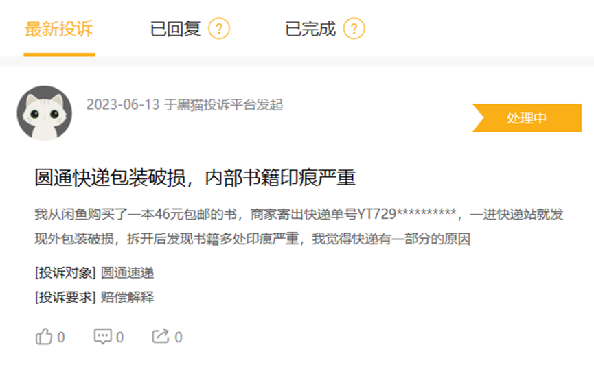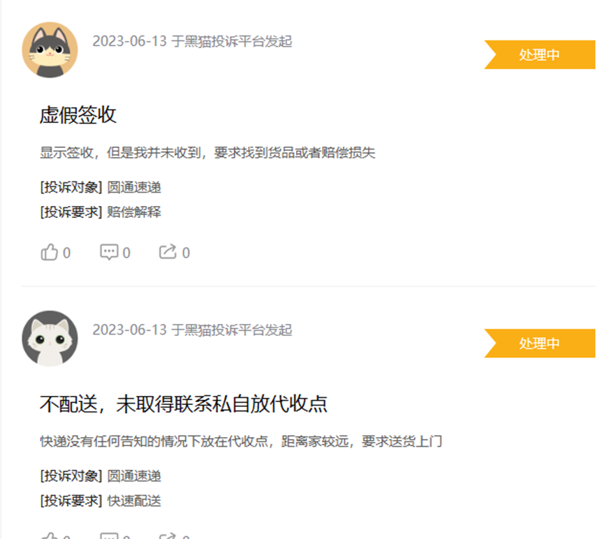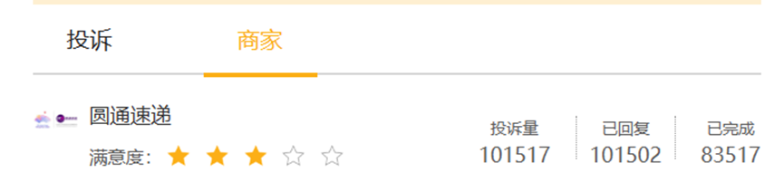 截至6月13日,在黑猫投诉平台,圆通速递投诉量有101518条,已完成83517条,近30条投诉量有1134条,已完成202条,投诉完成率偏低。