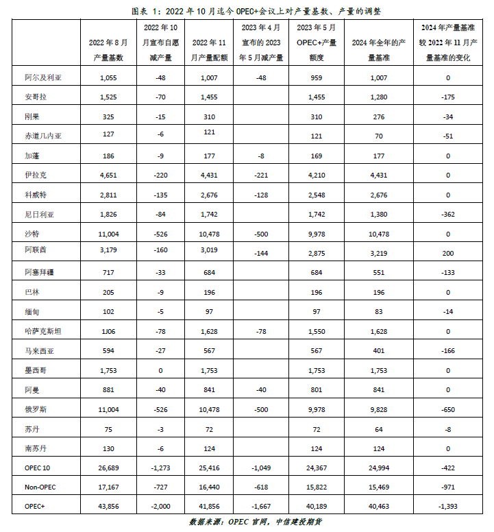 仔细探究我们发现,安哥拉、刚果、赤道几内亚、尼日利亚、阿塞拜疆、缅甸、马来西亚、俄罗斯以及苏丹共九个国家都出现了产量基数的下调。OPEC+在附件表中尤其提到,安哥拉、尼日利亚后期的产量如果有提升,将会选用最新产量,例如尼日利亚2024年的产量计划为157.8万桶/日。针对俄罗斯最新的产量基准,OPEC+表示,根据二手来源的平均值评估,982.8万桶/日的产量是2023年2月所需的生产水平,由于该国目前正在与专业资讯机构合作更新生产数据,因此将在2023年6月之前进行修订。