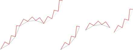 一段趋势把每段行情分拆开后,都形成了自己独立的趋势,都是由无数三角形组合而成,通过图二,图三的理解,可以看出趋势的此消彼长的交替过程。