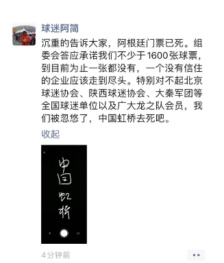 6月13日,中国龙之队球迷会会长简满根在朋友圈宣布:“组委会答应承诺我们不少于1600张球票,到目前为止一张都没有。”包括北京球迷协会、陕西球迷协会等全国多个球迷单位以及龙之队会员都将错过这场比赛。