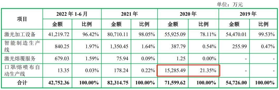2019年森峰科技营业收入为5.6亿元,净利润为负的479万元(扣除非经常性损益后归属于母公司普通股股东净利润为-1,536万元),而到了2020年这一组数据就转变成了营业收入7.3亿元,净利润为8,247万元(扣除非经常性损益后归属于母公司普通股股东净利润为1,638万元),营业收入增加1.7亿元,净利润增加8,726万元,这个巨大变化已经不能仅仅用扭亏为盈来形容了,简直是华丽蜕变咸鱼翻身。究其原因,口罩业务的贡献功不可没,如下图,发行人主要业务为激光加工设备,报告期内该类收入占总营业收入比分别为99.53%、78.11%,98.05%以及96.42%,细心的朋友可能会发现2020年该类业务收入占比骤降了,这是由于森峰科技在2020年加入口罩业务当年即产生收入1.5亿元,贡献营业收入占比21.35%,贡献毛利1.1亿元,毛利率高达75%。