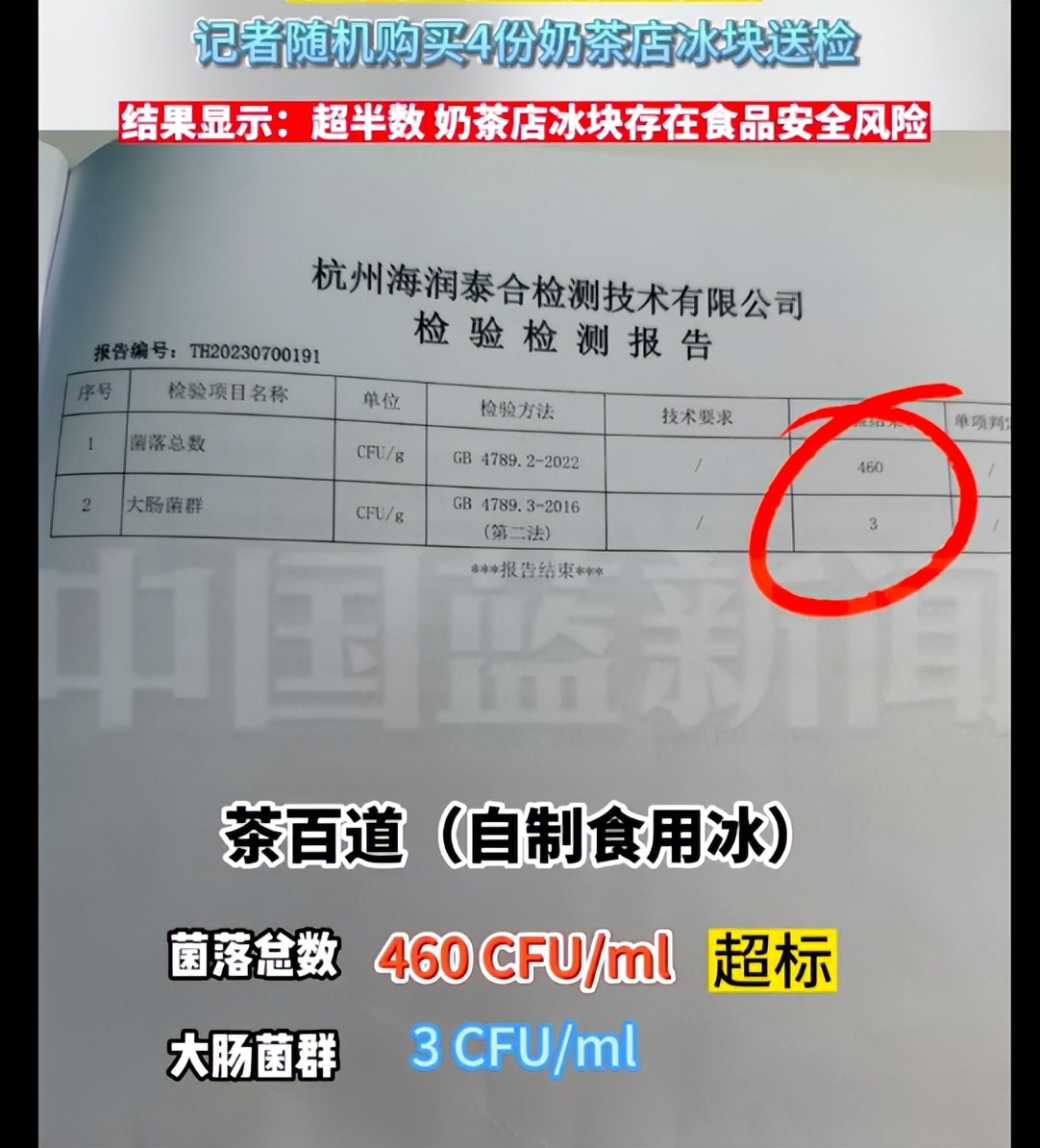 其中一家冰块被检出菌落总数超标的奶茶品牌是茶百道杭州西湖文化广场门店。该门店的冰块菌落总数为460CFU/g,中国蓝新闻在报道中指出餐饮环节的散装食用冰尚无国家标准,抽检人员参照预包装食用冰标准做了风险评估,根据要求,菌落总数标准为100CFU/g,显然茶百道门店的冰块已经超出了这一标准,存在风险。