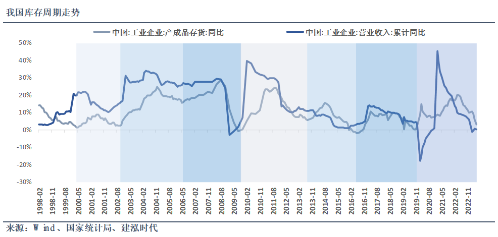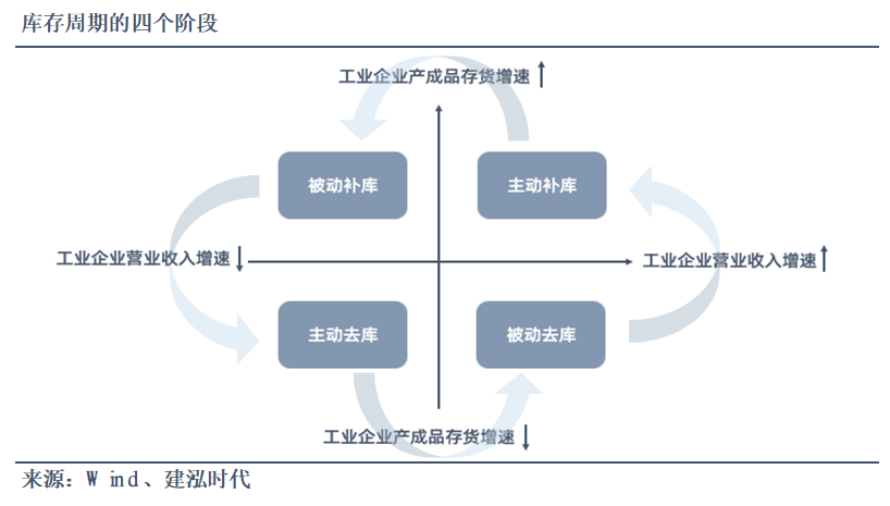 根据需求和库存的变化,库存周期主要分为“被动去库存-主动补库存-被动补库存-主动去库存”四个运行阶段,通常可以利用“工业企业产成品存货增速”和“工业企业营业收入增速”两个指标来判断库存周期所处阶段。(1)被动去库存阶段:当营业收入增速上行、库存增速下行时属于被动去库存阶段,通常在政策推动下需求回暖,生产端反应滞后未及时增产,需求上升库存被动减少。(2)主动补库存阶段当营业收入增速和库存增速同时上行时属于主动补库存阶段,此时盈利开始回暖,企业投资意愿增强,逐步传导至产业链中上游,供应端主动扩大生产,需求和库存同步上升。(3)被动补库存阶段:当营业收入增速下行、库存增速上行时属于被动补库存阶段,受货币收紧、通胀回升、政策支持减弱、市场竞争加剧等因素影响企业盈利开始回落,但生产端仍有惯性未能及时减产,供大于求导致库存增加。(4)主动去库存阶段:当营业收入增速和库存增速同时下行时属于主动去库存阶段,此时需求回落,企业投资意愿减弱,供应端主动减少生产,库存减少,但进入主动去库的尾声也意味着新一轮库存周期正在等待开启。整体来看,主动补库存和被动去库存阶段往往与经济上行趋势相对应,而被动补库存和主动去库存阶段则对应着经济下行趋势。