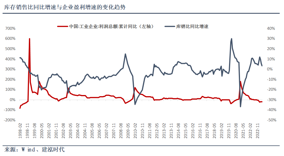库存销售比是理解库存周期的重要一环,根据定义库存销售比是产成品库存和营业收入的比值,综合反映了库存和营收两者的相对强弱程度,库销比同比增速下行通常对应着企业盈利增速上行。当库销比同比增速见底回升时,企业盈利通常会达到顶峰后开始回落,主要是由于需求见顶后库存受惯性影响仍存在补库行为,造成供需不平衡的局面,库存周期进入被动补库存、主动去库存的阶段。一方面高库存会占用企业较大的资金,另一方面企业会利用促销手段进行主动去库从而导致企业盈利下降。当主动去库持续一段时间后,需求和库存逐渐匹配,库销比同比增速达到顶峰后开始回落,往往对应着企业盈利开始见底回升。从历史经验来看,库销比同比增速的最高点通常与工业企业盈利的最高点保持同步或者领先其一个季度左右。本轮库存周期受疫情影响库销比同比增速出现了两次触顶,分别是2022年5月和2023年2月,目前库销比同比增速仍处于顶部区域,意味着供需格局最差的时期已经结束,企业继续降价去库存的空间相对有限,企业盈利逐步见底回升。