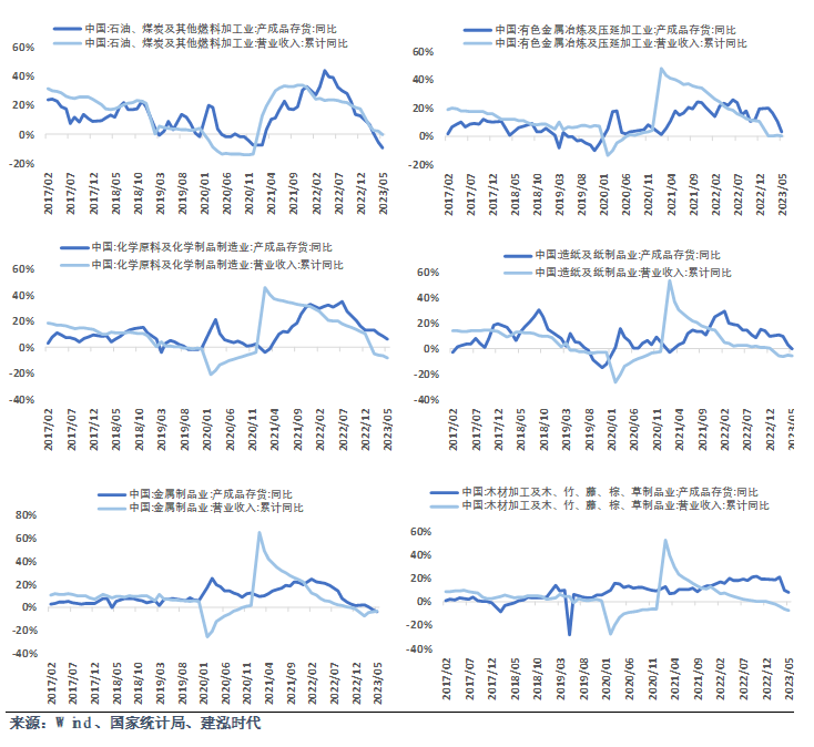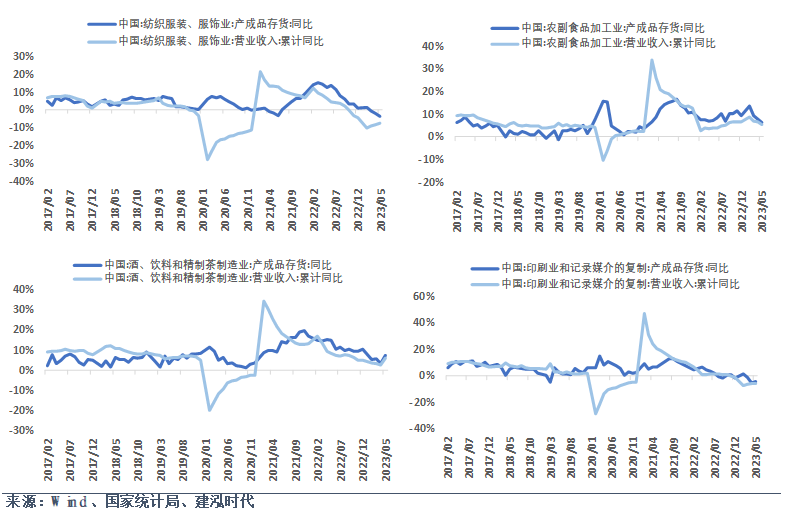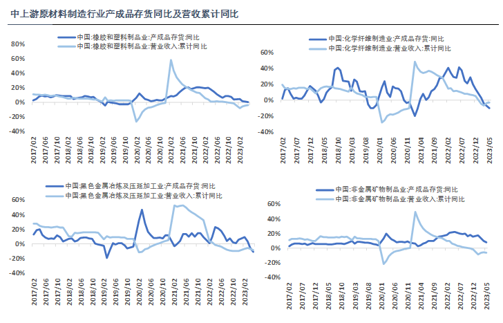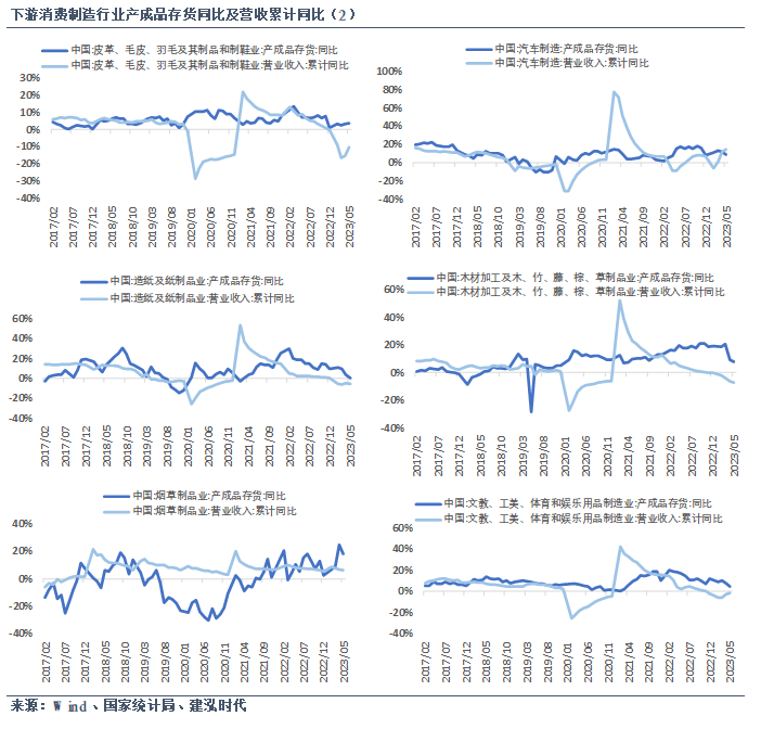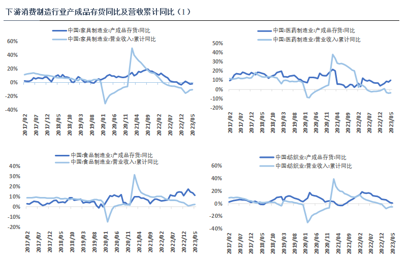 下游消费制造行业涵盖了家具制造、医药制造、食品制造、纺织、服装服饰、农副食品加工、酒饮料茶、印刷、造纸、皮革制鞋、汽车制造、烟草制品、木材制品、文体用品等细分领域,下游消费制造行业是疫情政策放开后需求最早复苏的领域,因此去库存的速度较快。目前医药制造业处于被动补库存阶段,营业收入累计同比持续下探,但产成品存货同比持续增加。酒饮料茶和皮革制鞋已进入主动补库存阶段,产成品存货同比和营业收入累计同比均呈上升态势。农副食品加工、烟草制品和木材制品处于主动去库存阶段,农副食品加工的产成品存货同比已从2023年2月的13.6%连续3个月下滑至5月的6.2%,营业收入累计同比从2月的8.5%连续三个月下降至5月的5.4%;造纸的产成品存货同比已从2023年2月的11%连续3个月下滑至5月的0.2%,营业收入累计同比连续三个月维持在-5%左右;烟草制品的产成品存货同比从2023年4月的24.5%下滑至5月的18%,营业收入累计同比从4月的6.8%下降至5月的6.3%;木材制品的产成品存货同比已从2023年2月的18.6%下滑至5月的7.8%,营业收入累计同比从2月的-2.2%连续三个月下降至5月的-7.4%。家具制造、食品制造、纺织、服装服饰、造纸、印刷、汽车制造、文体用品等领域均处于从主动去库存向被动去库存过渡阶段。家具制造、食品制造、纺织、服装服饰、造纸、印刷、汽车制造、文体用品的产成品库存同比大部分呈下降态势,而营业收入累计同比开始企稳回升,下游消费需求逐步回暖,库存周期逐渐从主动去库存向被动去库存转换。从库存同比历史分位数来看,服装服饰、印刷、家具制造等行业的库存分位数已趋近于零,分别为0%、1.6%和2.4%,造纸的库存分位数为19.3%,处于历史较低位置;酒饮料茶和皮革制鞋的库存分位数分别为39.5%和24.1%。从盈利变化来看,家具制造、医药制造、食品制造、纺织、服装服饰、皮革制鞋、汽车制造和木材制品的利润有边际改善,2023年5月较4月分别提升了4.9/1.9/2.1/2.4/9.7/16.1/21.8/2.1个百分点,其中皮革制鞋、汽车制造和服装服饰的利润改善最显著。