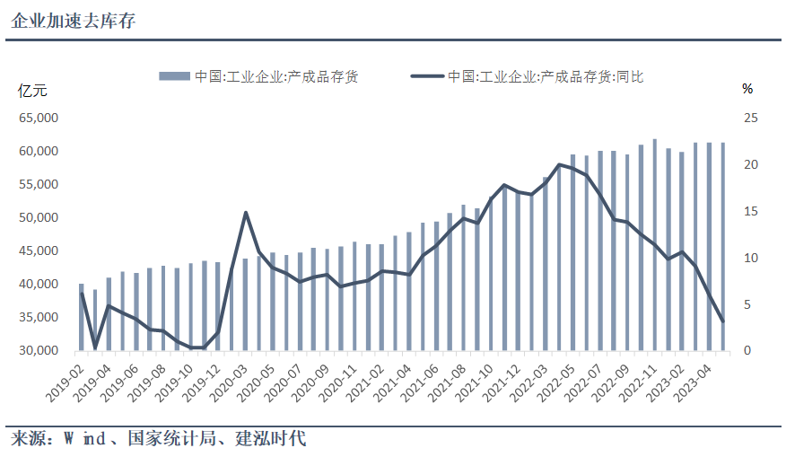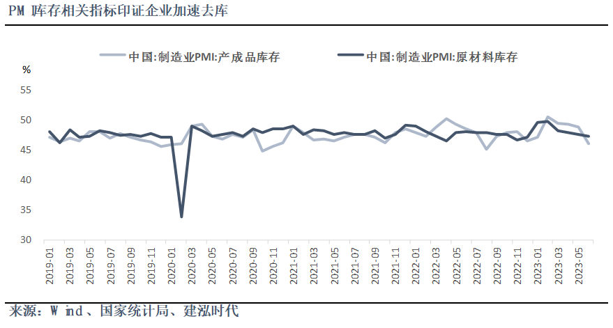 从基本面来看,目前工业部门仍处于衰退期,2023年4月、5月和6月的制造业PMI均处于荣枯线以下,企业的盈利预期持续降低,当需求走弱时企业选择主动减产、降低库存,工业企业去库速度呈加速趋势。根据国家统计局数据显示,2023年5月我国工业企业产成品存货为6.14万亿元,同比增速为3.2%,增速与4月相比下降了2.7个百分点,自今年2月以来库存同比增速降幅均保持在2个百分点以上。从PMI指标来看,6月制造业PMI原材料库存指数和制造业PMI产成品库存指数分别为和47.4%和46.1%,环比分别下降0.2和2.8个百分点,印证了企业加速去库存的趋势。