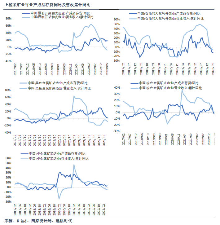 上游采矿业涵盖了煤炭采选、油气开采、黑色金属采选、有色金属采选、非金属采选等主要细分领域,整体来看上游采矿业的库存水平相对较高,主要是由于下游需求低迷导致上游产品的去库存速度较为缓慢,总体仍处于主动去库存阶段,行业去库压力较大。目前油气开采、黑色金属采选和有色金属采选行业处于主动去库存阶段,产成品库存增速快速下降,营收增速也呈下行趋势;而煤炭采选和非金属采选行业则处于被动补库存阶段,产成品库存增速回升,营收增速下降。在库存位置方面,2023年5月油气开采、有色金属采选、非金属采选的库存历史百分位数均在30%以下,分别为13.70%、28.20%和20.90%,处于库存历史较低水平。