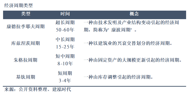 经济周期根据时间长度不同可以分为四大类,一是50-60年超长周期的康德拉季耶夫周期(简称康波周期),主要是由技术创新驱动;二是15-25年中长周期的库兹涅茨周期,主要由房地产和建筑业兴衰交替驱动;三是8-10年短中周期的朱格拉周期,主要是由设备更替和资本投资驱动;四是3-4年短周期的基钦周期,主要由库存变化驱动。基钦周期指的就是库存周期,由美国经济学家约瑟夫·基钦于1923年提出,一轮完整的库存周期约为3-4年,属于经济周期中的短周期。库存是衡量供需关系的重要指标之一,由于供给侧的变动相对滞后于需求侧,因此库存水平会出现周期性变动。通过分析库存周期可以了解供需关系持续调整变化的过程,帮助定位经济周期所处位置。