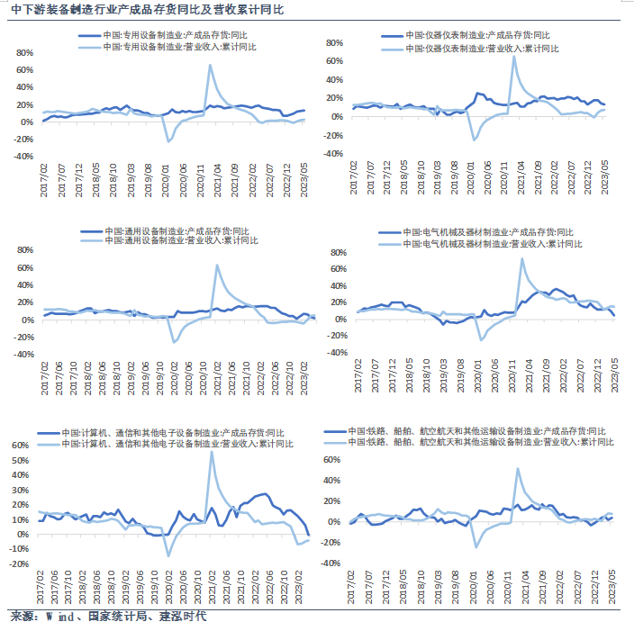 中下游装备制造行业主要包括专用设备、仪器仪表、通用设备、电气机械、计算机通信电子设备和运输设备等细分行业,大多数属于先进制造业,主要受出口动能驱动,存在产能过剩问题。当前专用设备和运输设备处于主动补库存阶段,专用设备的产成品存货同比在2022年12月见底后开始回升,截止2023年5月产成品存货同比为13.2%,其营收增速也稳步提升。运输设备的产成品存货同比自2022年11月触碰最低点-2.9%后开始回升,2023年5月产成品存货同比为4.1%。电气机械、仪器仪表、通用设备和计算机通信电子设备正处于从主动去库向被动去库存转换阶段,产成品存货同比延续下行态势,但营收增速开始企稳回升。电气机械及器材2023年2月营业收入累计同比为12%,5月数据为15.1%;仪器仪表2023年2月营业收入累计同比为-0.4%,5月数据为7.8%;通用设备2023年2月营业收入累计同比为-3.9%,5月数据为5%;计算机通信电子设备营业收入累计同比的降幅也已连续三个月收窄,这四个行业的需求边际改善,带动库存进一步释放。从盈利变化来看,专用设备、仪器仪表、通用设备和计算机通信电子设备的利润明显改善,2023年5月较4月分别改善了7.3/4.9/2.7/4.0个百分点。从库存同比历史百分位来看,通用设备、电气机械和计算机通信电子设备的库存分位数分别为6.4%、23.3%和8%,处于历史偏低位置。