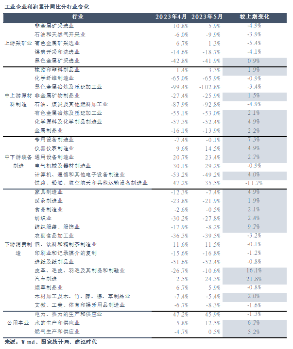 (3)下游消费制造:重点关注皮革制鞋、服装服饰、汽车制造、印刷和家具制造。皮革制鞋已进入主动补库存阶段,库存分位数为24.1%,利润改善明显,2023年5月较4月利润累计同比提升了16.1个百分点。服装服饰、汽车制造、印刷和家具制造等均处于从主动去库存向被动去库存过渡阶段,其中服装服饰、印刷和家具制造的库存分位数已趋近于零,分别为0%、1.6%和2.4%,库存去化充分;汽车制造的库存去化仍有下降空间,但是其盈利表现最佳,2023年5月较4月利润累计同比改善了21.8个百分点;此外服装服饰的利润改善也十分明显,提升了9.7个百分点。